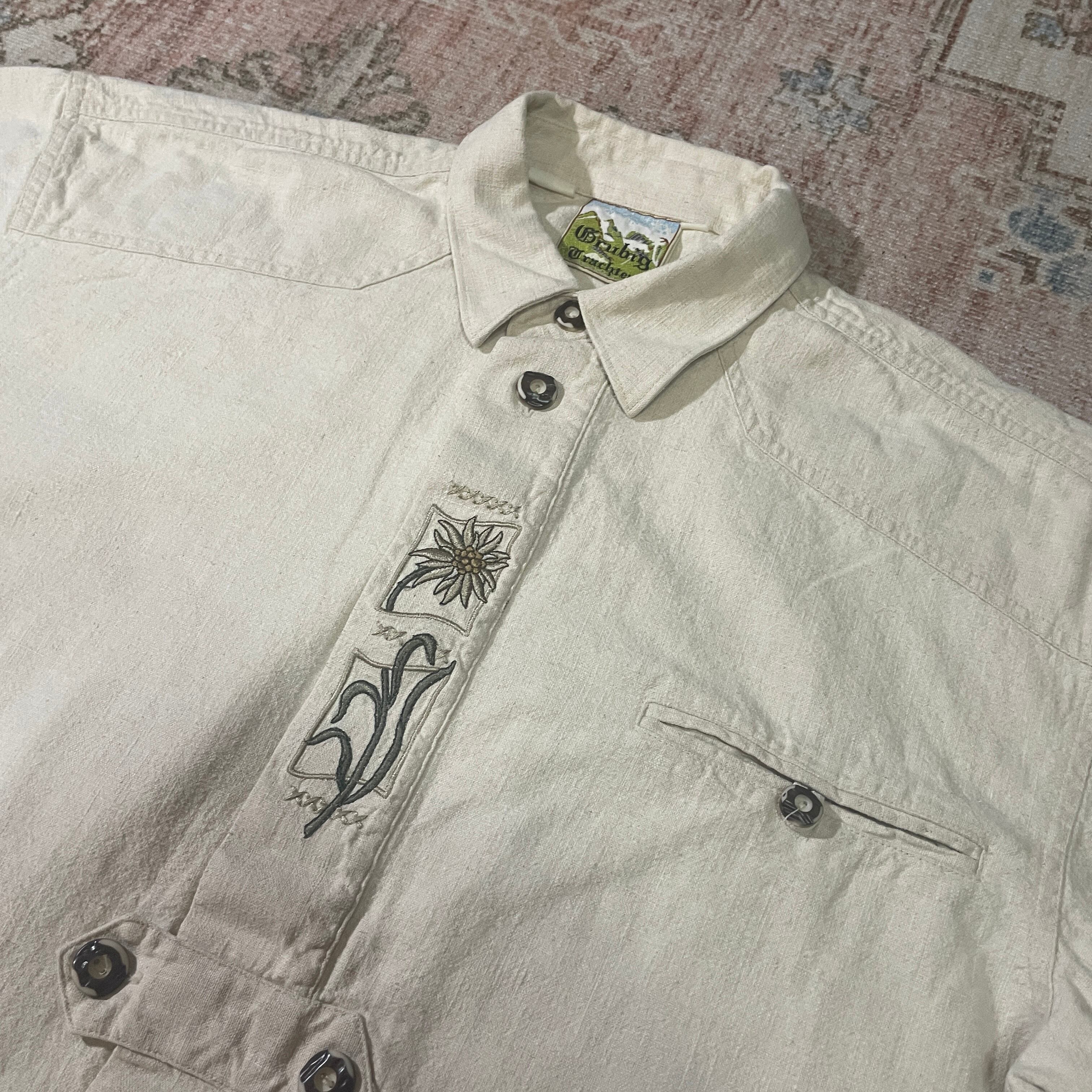 ボタンには鹿の角を削って作られた、アルプス地方の伝統的なディテールが使われています。チロリアンシャツは、オーストリアやドイツ南部の山岳地域で生まれ、民族衣装として親しまれてきたアイテム。自然や山の恵みをモチーフにした刺繍や、木や角といった天然素材のボタンは、その文化と暮らしを象徴しています。