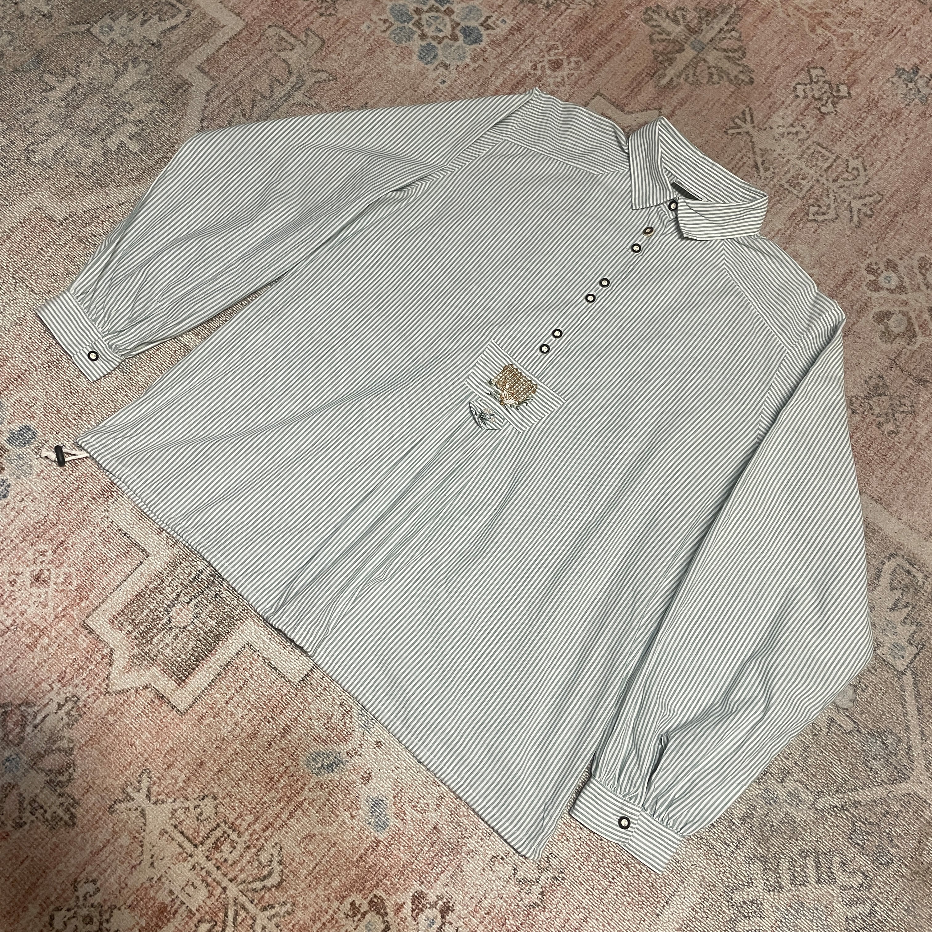 ボタンには鹿の角を削って作られた、アルプス地方の伝統的なディテールが使われています。チロリアンシャツは、オーストリアやドイツ南部の山岳地域で生まれ、民族衣装として親しまれてきたアイテム。自然や山の恵みをモチーフにした刺繍や、木や角といった天然素材のボタンは、その文化と暮らしを象徴しています。