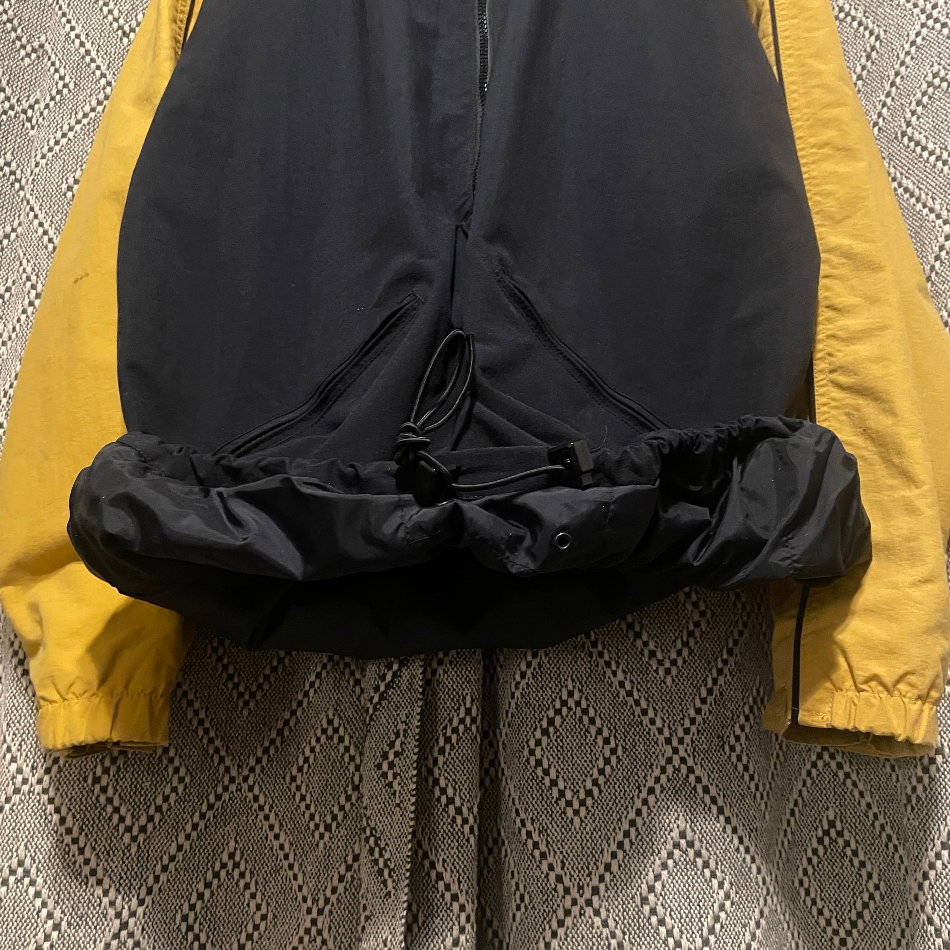 ブラック・イエローの切り替えデザイン、お尻部分の裏地は防水仕様になってますのでスノーボードなどのアクティビティを想定した1着だと思います。