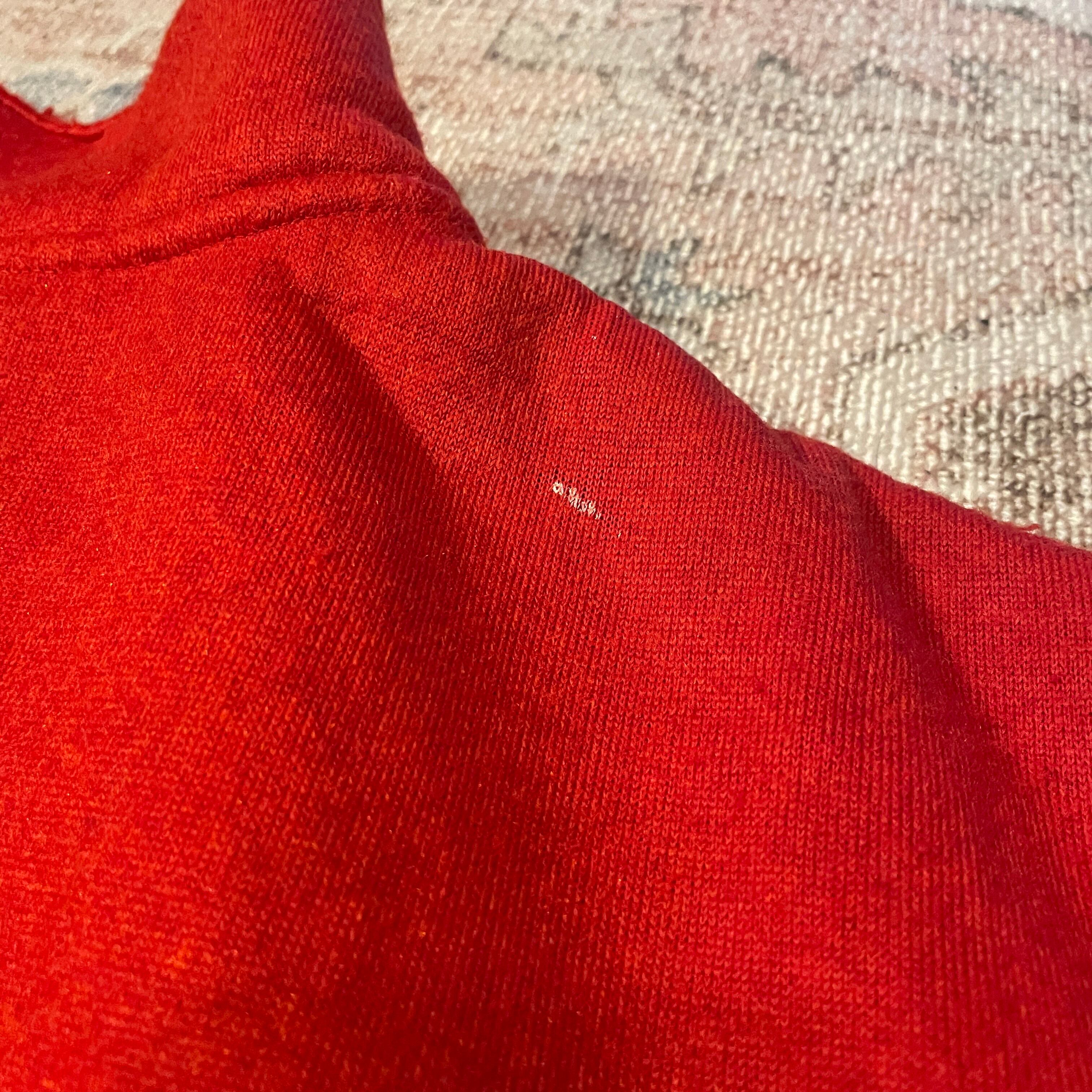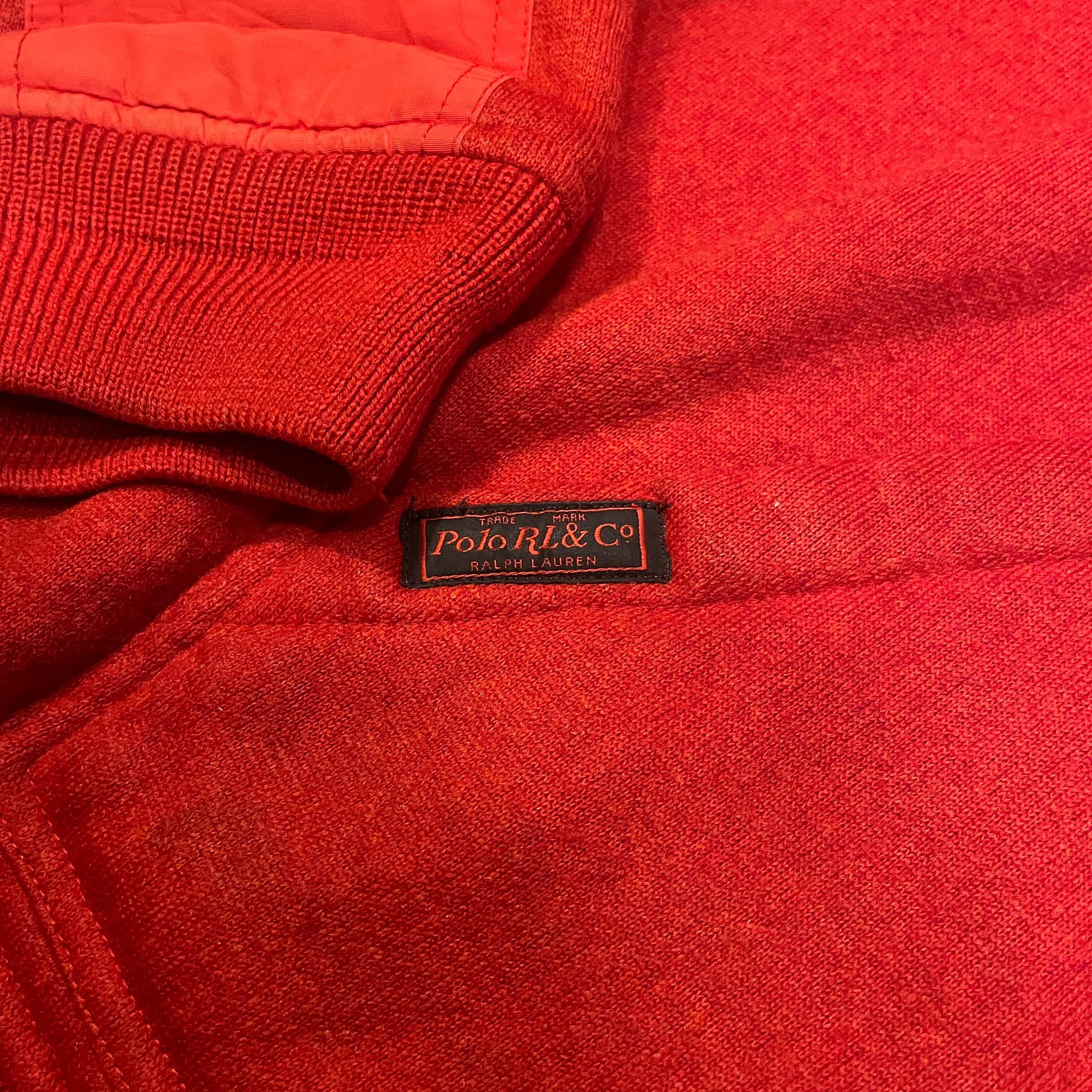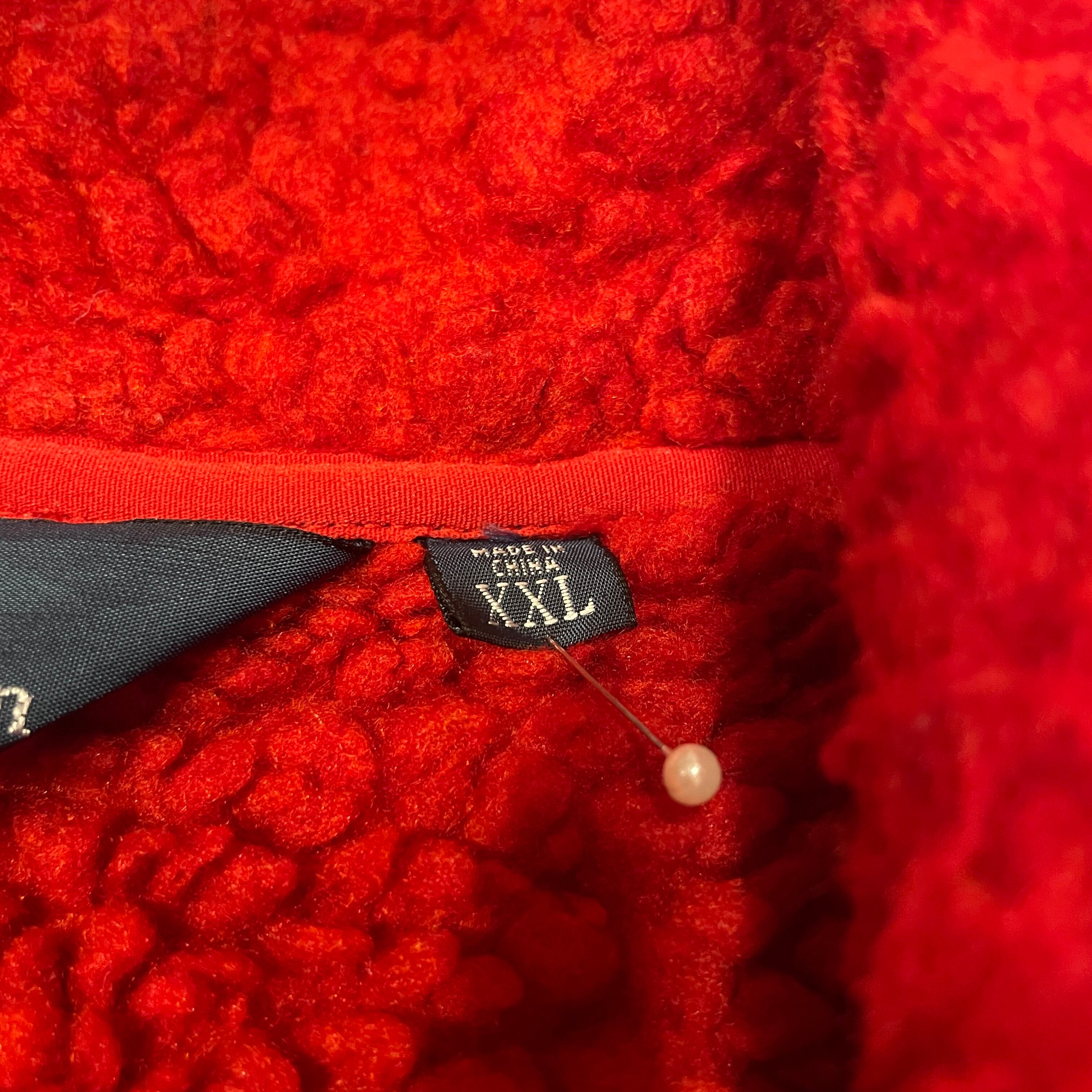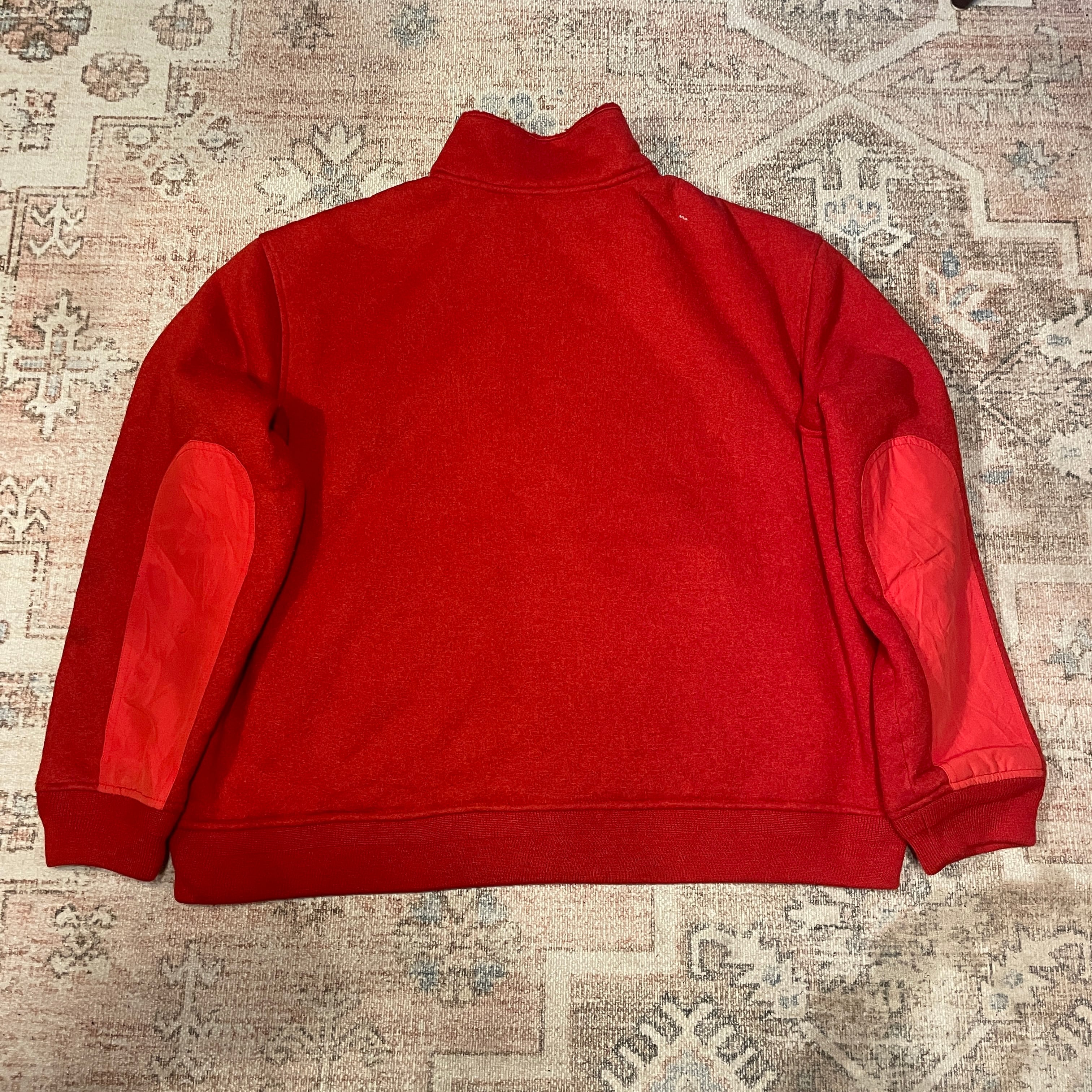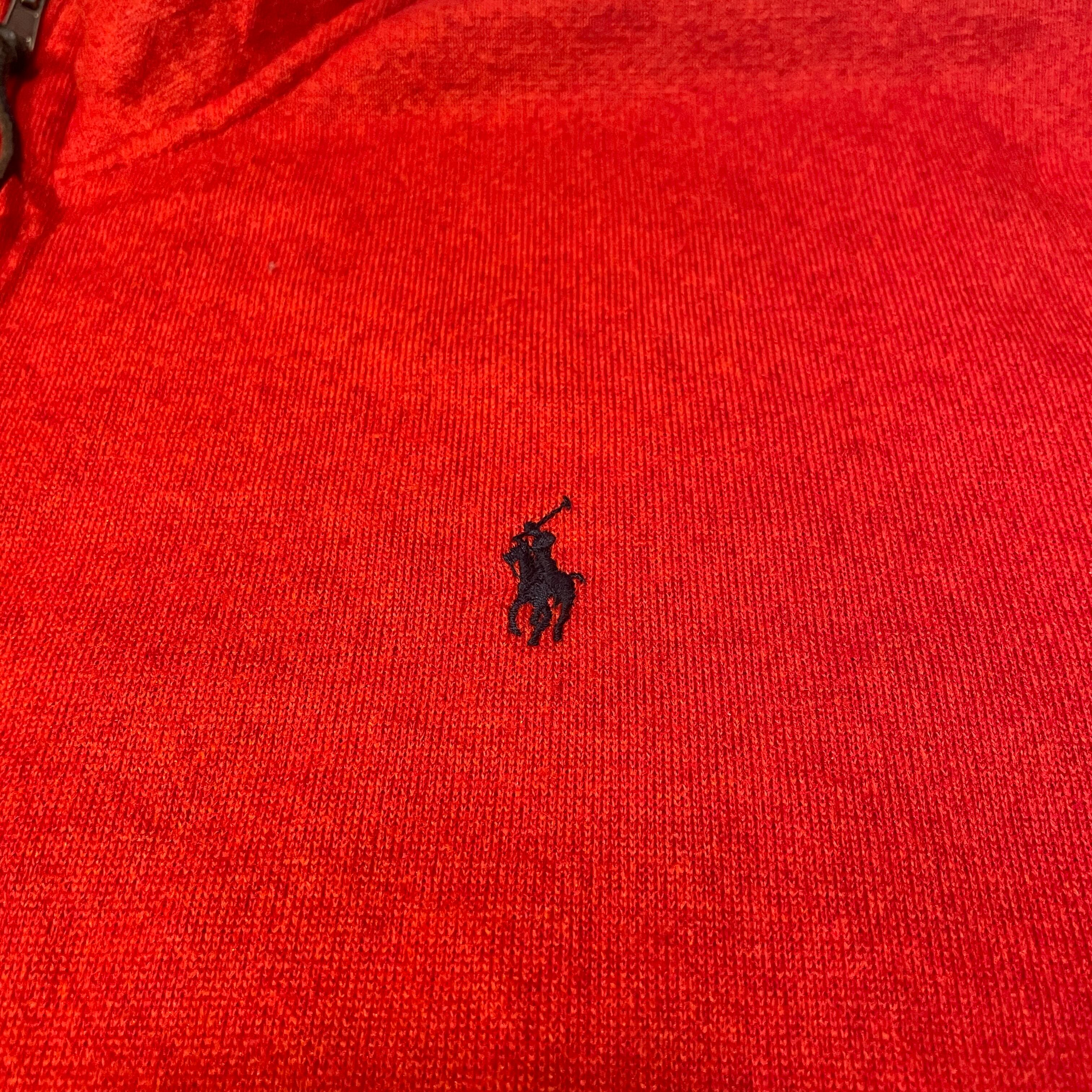 XXLのかなり大きいサイズ表記ですが、着丈はそこまで長くありません。エルボー部分は素材が切り替わります。鮮やかなレッドにワンポイントのポロ刺繍の1着。